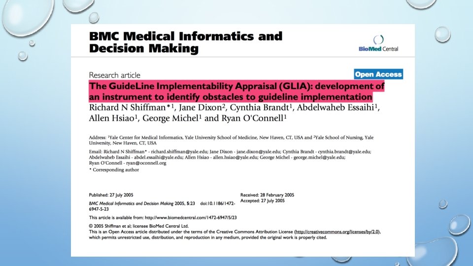 • Un grupo de Costa Rica con participación de otros en la región inició el desarrollo del proyecto de validación en español del instrumento GLIA [Guía de Evaluación de la Implementabilidad - GUIDELINE IMPLEMENTABILITY APPRAISAL] (SHIFMAN, 2005) para promover su adaptación y utilización en la región. El proyecto se presentó en la conferencia CISBE 2017 en Fortaleza , Brasil. • “GLIA” tiene como objetivo proporcionar información sobre la implementabilidad de una guía para: • Un grupo de autores de GPC, que puede decidir modificar su contenido, para mejorar la implementación. • Para aquellas personas que seleccionan GPC para su aplicación dentro de un sistema de atención de la salud, en cuyo caso, “GLIA” puede usarse para anticipar problemas potenciales en la implementación y hacer los ajustes correspondientes.