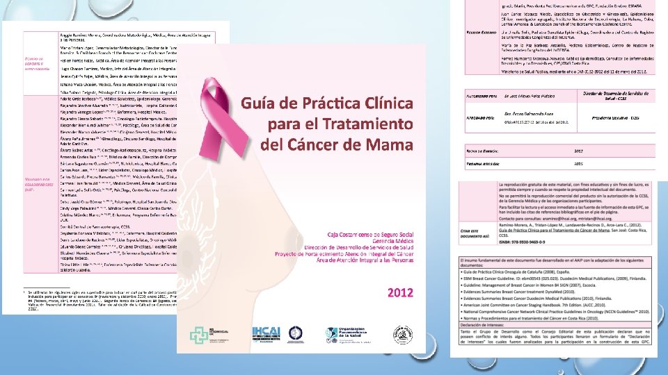 Elaboración/Adaptación de GPC • El Área de Atención Integral a las Personas de la DDSS (antes conocida como el departamento de medicina preventiva), asumió la construcción de documentos de normalización técnica en el área clínica y atención a las personas desde su creación en 1987. • En el 2004 el departamento de farmacoterapia, hoy fármaco-epidemiologia, de la CCSS inició un proceso de construcción sistemática de Guías de Práctica Clínica, que denominaron Guías Clínicas de Tratamiento. Se produjeron 36 guías clínicas de tratamiento. El mismo departamento actualizó 8 de esas guías en el año 2011. • En la actualidad distintos departamentos de la CCSS, del MINSA y Asociaciones de especialista realizan esfuerzos en la publicación de GPC, protocolos de tratamiento y otros documentos, con diferentes nombres y diferentes metodologías de construcción. • En el 2012 se realiza una Guía de Práctica Clínica para el tratamiento de Cáncer de mama, con un método estandarizado y validado en el AAIP. Cumplía con todos los pasos que describe el instrumento AGREE para evaluar la calidad metodológica de construcción de una GPC.