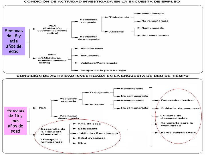 Capítulo V. CARACTERÍSTICAS GENERALES (Para todos los miembros del hogar) Se anotan datos demográficos de las personas que residen en el hogar: sexo, edad, parentesco con el jefe del hogar, estado conyugal, nivel de escolaridad y discapacidad de todas las personas que residen habitualmente en la vivienda. 10 preguntas. Capítulo VI. CARACTERÍSTICAS ECONÓMICAS (Para las personas de 15 y más años de edad) Se aplica a las personas de 15 y más años de edad, en él se investigan: condición de actividad, la categoría en la ocupación y el tiempo que se invierte en el Trabajo Remunerado. 14 preguntas. Se investigan 17 temas referentes al uso del tiempo: Capítulo VII. Necesidades personales, Producción Agropecuaria, ACTIVIDADES SOBRE Actividades educativas, Actividades culinarias, Aseo USO DEL TIEMPO de la vivienda, Construcción y reparaciones, arreglo DE LAS PERSONAS de ropa, Compras, Gerencia u organización, Cuidado de (Para las personas de 15 y más años de edad) menores, Cuidados de enfermos no crónicos y otros, Transferencias de trabajo a otros hogares, Trabajo voluntario, Familia y sociabilidad, Tiempo libre y Cuidado de discapacitados. 108 preguntas.