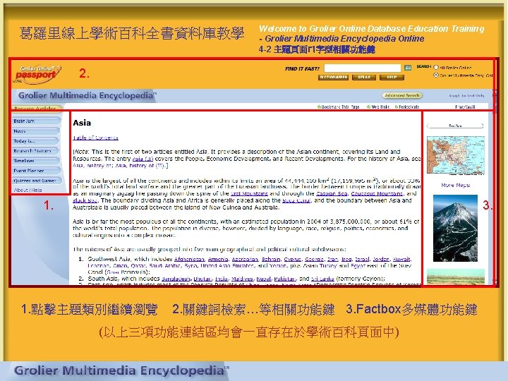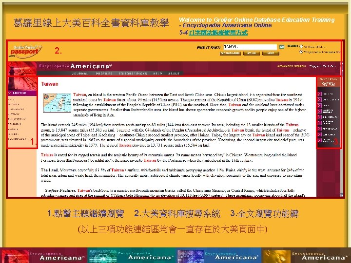 葛羅里線上學術百科全書資料庫教學 Welcome to Grolier Online Database Education Training - Grolier Multimedia Encyclopedia Online 4 -4. 3 Find Fast 關鍵詞搜尋框 3 此版面即為學術百科全文結果完整頁面 !