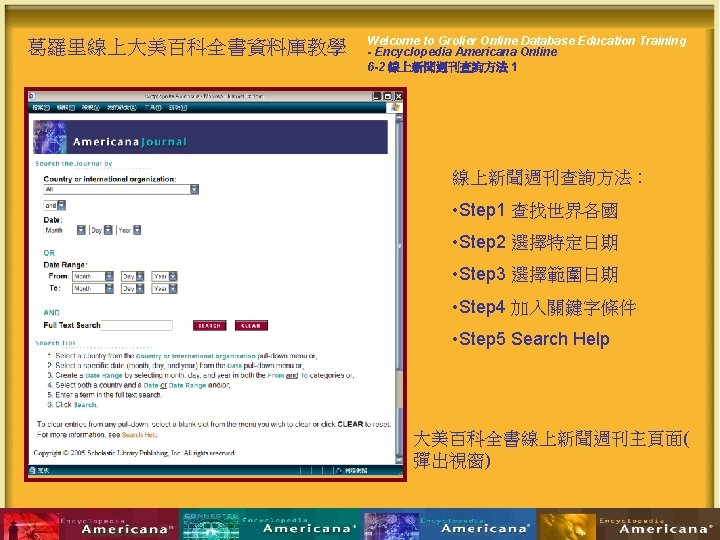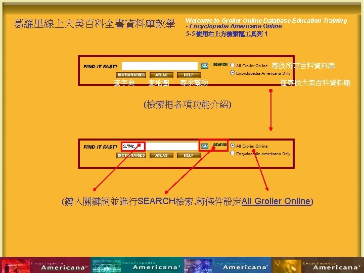 葛羅里線上大美百科全書資料庫教學 Welcome to Grolier Online Database Education Training - Encyclopedia Americana Online 5 -5 使用右上方檢索框 具列 4 (將條件設定為 Encyclopedia Americana Only) (鍵入關鍵詞並進行SEARCH檢索 !)