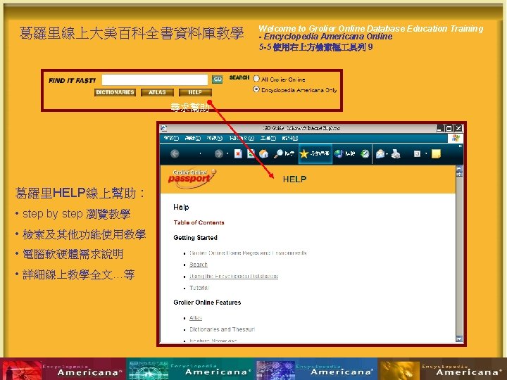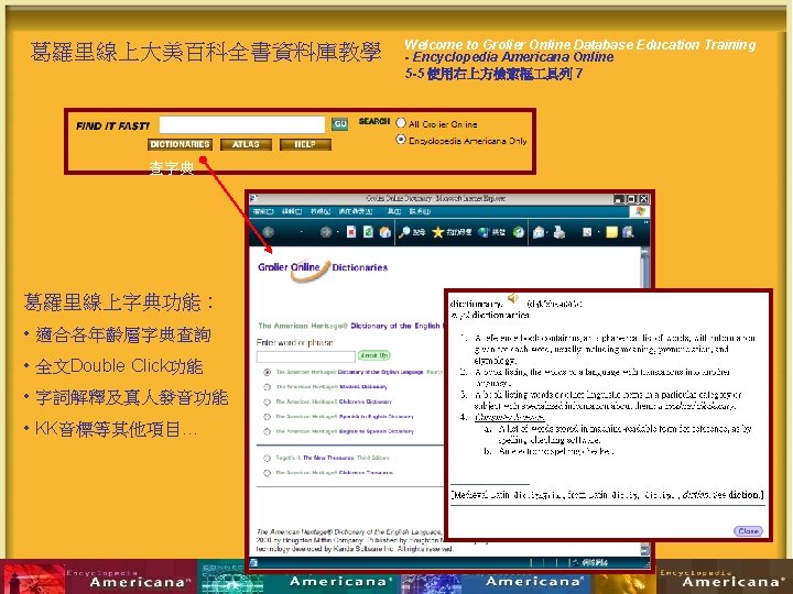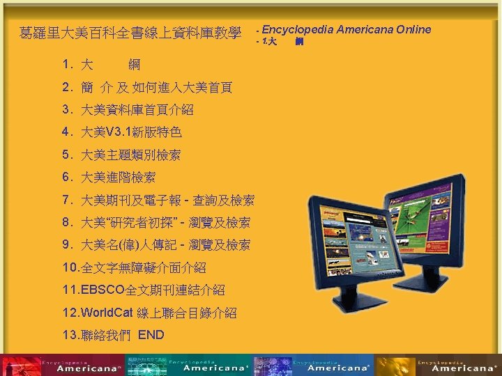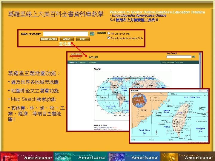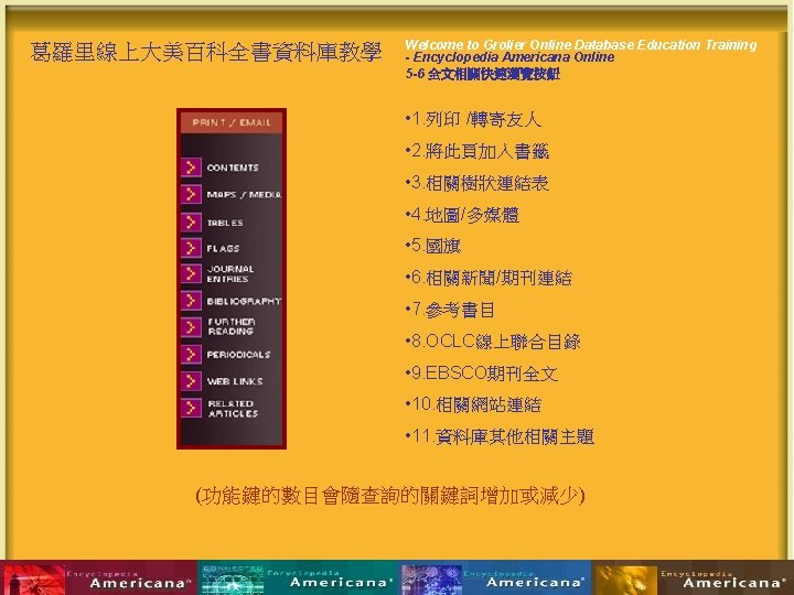 葛羅里線上大美百科全書資料庫教學 Welcome to Grolier Online Database Education Training - Encyclopedia Americana Online 2 -2 大美百科全書相關簡介 2007年新版線上大美百科全書資料庫 - 簡 介