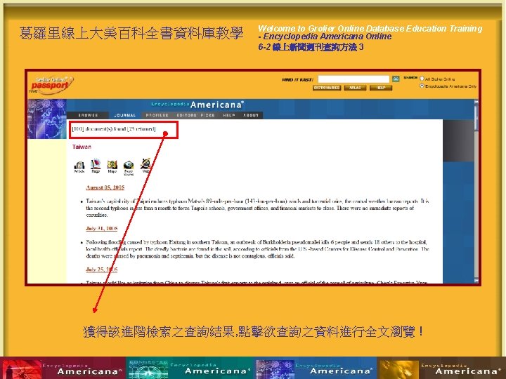 葛羅里線上大美百科全書資料庫教學 Welcome to Grolier Online Database Education Training - Encyclopedia Americana Online 5 -5 使用右上方檢索框 具列 5 點擊取得大美百科線上資料庫之全文結果頁面 !