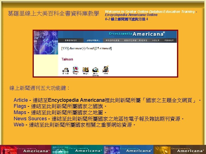 葛羅里線上大美百科全書資料庫教學 Welcome to Grolier Online Database Education Training - Encyclopedia Americana Online - 6. 主題式類別檢索介紹(二) 大美線上新聞週刊 Journal 6 -1 2. 點擊藍色 Journal 圖示進行線上新聞週刊的查詢及檢索