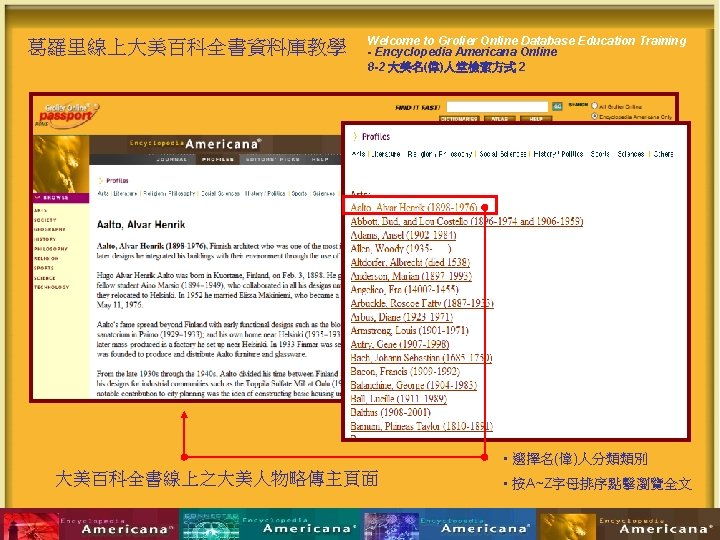 葛羅里線上大美百科全書資料庫教學 Welcome to Grolier Online Database Education Training - Encyclopedia Americana Online 8 -2 大美名(偉)人堂檢索方式 1 大美百科全書線上之大美人物略傳主頁面