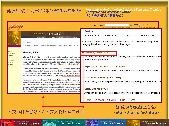 葛羅里線上大美百科全書資料庫教學 Welcome to Grolier Online Database Education Training - Encyclopedia Americana Online - 8. 主題式類別檢索介紹(四) 大美名(偉)人堂 Profiles 8 -1 4. 點擊咖啡色 Profiles 圖示進行大美名人堂暨偉人傳記-瀏覽檢索