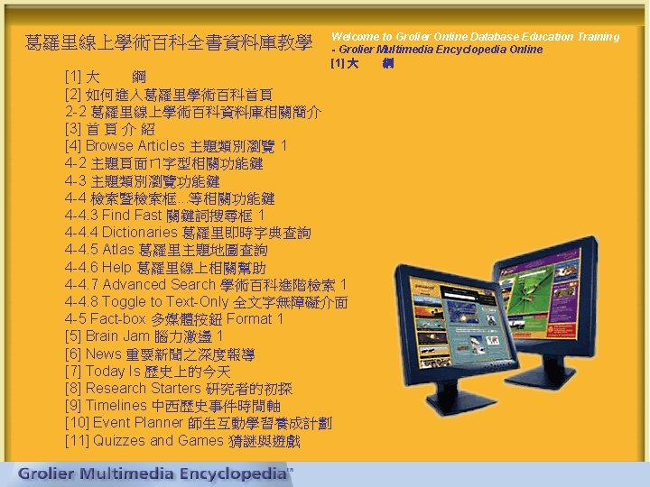 ![葛羅里線上學術百科全書資料庫教學 Welcome to Grolier Online Database Education Training - Grolier Multimedia Encyclopedia Online [10] 葛羅里線上學術百科全書資料庫教學 Welcome to Grolier Online Database Education Training - Grolier Multimedia Encyclopedia Online [10]](https://slidetodoc.com/presentation_image_h/d65b938ac71f73e1ad762e9852ea3412/image-84.jpg)