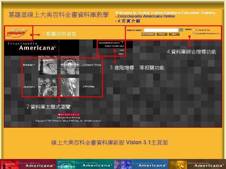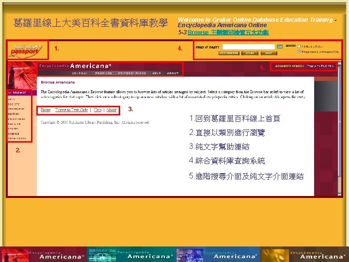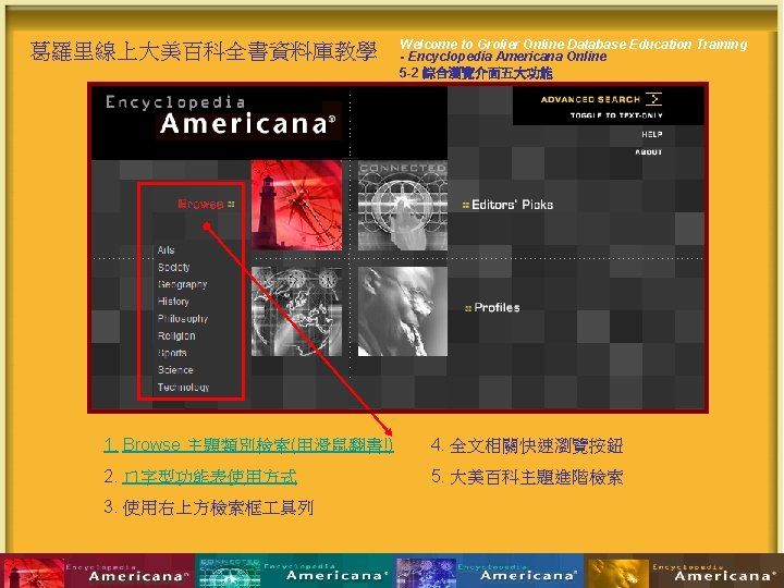葛羅里線上學術百科全書資料庫教學 Welcome to Grolier Online Database Education Training - Grolier Multimedia Encyclopedia Online [4] Browse Articles 主題類別瀏覽 1 點擊進入 主題類別瀏覽 資料庫結果頁面 !