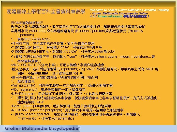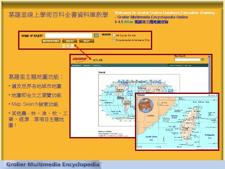葛羅里線上學術百科全書資料庫教學 Welcome to Grolier Online Database Education Training - Grolier Multimedia Encyclopedia Online 2 -2 葛羅里線上學術百科資料庫相關簡介 2007年新版線上學術百科全書資料庫 - 簡 介