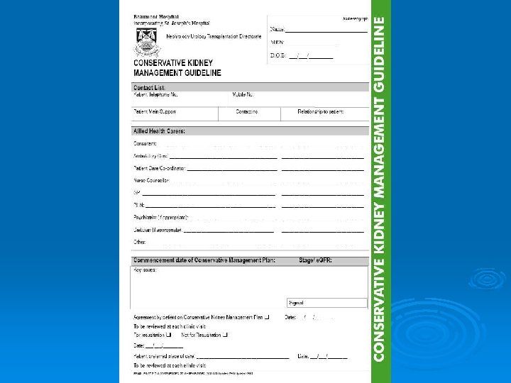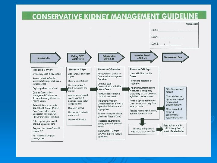 Conservative Kidney Management Guideline Ø Applies at point on the disease trajectory where the patient has made a decision not to opt for dialysis , Likely at CKD stage 3 -4