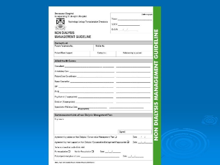 Steering Committee Ø 1 Nephrologist Ø 1 Consultant Palliative Medicine/ Specialist Palliative Care Nurse Ø 1 Renal Registrar Ø 2 Patient Care Co-ordinators Ø 3 Ambulatory Care CNS Ø Staff Nurses Ø Renal Counsellors Ø Ø 10 meetings between April 2010 – Feb 2011 Signed off at Nephrology Guideline Committee Meeting 11 th March 2011