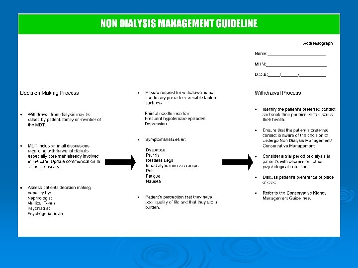 Non-dialysis Management Guideline. Ø Patients who have made a decision to withdraw from dialysis, and for whom dialysis is no longer a suitable treatment for clinical reasons. Ø NB – The patient continues to be actively cared for in all but the provision of dialysis. - proceed to Guideline for Conservative Management of Care in the last days of life.
