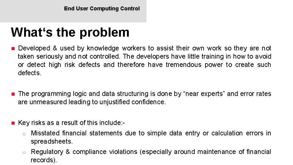 End User Computing Control What‘s the problem n Developed & used by knowledge workers to assist their own work so they are not taken seriously and not controlled. The developers have little training in how to avoid or detect high risk defects and therefore have tremendous power to create such defects. n The programming logic and data structuring is done by “near experts” and error rates are unmeasured leading to unjustified confidence. n Key risks as a result of this include: o Misstated financial statements due to simple data entry or calculation errors in spreadsheets. o Regulatory & compliance violations (especially around maintenance of financial records).