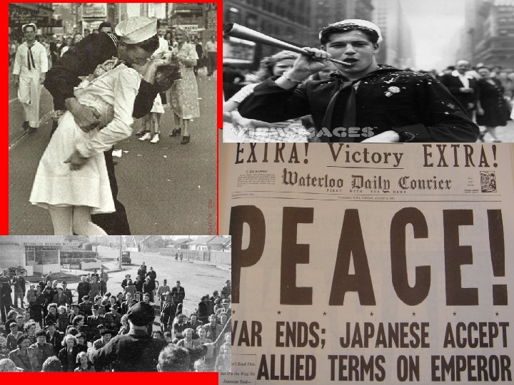 Aftermath • Japan finally surrenders September 2 nd, 1945 (VJ Day) • Japan’s emperor Hiroito speaks to his people for the first time ever the day after the second bombing at Nagasaki • Many more deaths to come from the bombings due to radiation poisoning, destruction of environment, etc