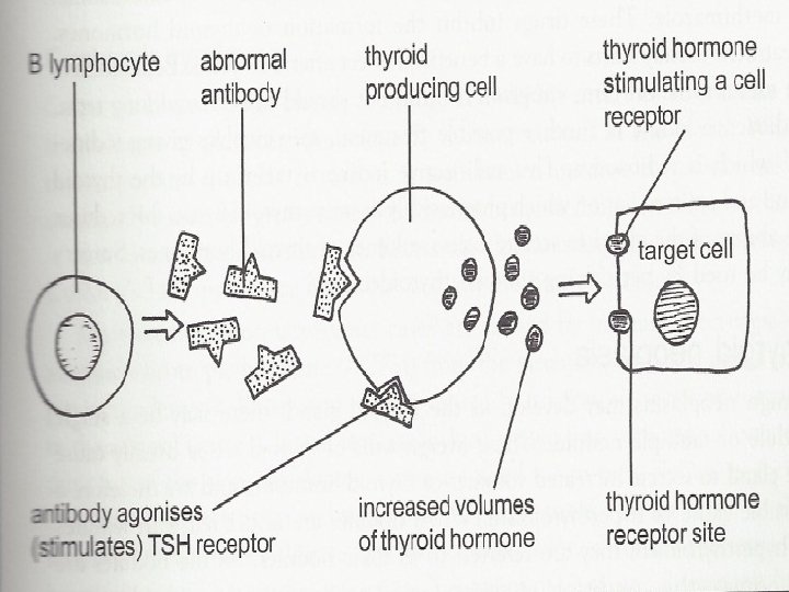 • Etiology of Grave’s Disease o For autoimmune reasons, a group of B lymphocytes secrete Ig. G which fits into and stimulates the TSH receptors present on cell membranes which increases the production of thyroid hormone.