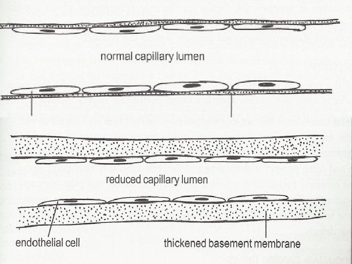 Chronic Complications of Diabetes Mellitus • Microvascular disease – There is a progressive thickening of the basement membranes which narrow the lumen and lowers elasticity. – This leads to localized ischemia and hypoxia, which causes more vascular compromise. – Retinopathy – Diabetic nephropathy