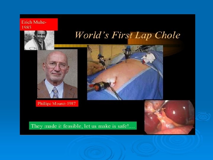 Laparoscopic surgery Ø 1975 laparoscopic salpingectomy Ø 1970 -1980 gyneprocedures Ø 1981 Semm /Germany 1 st lap appendectomy Ø 1989 lap cholecystectomy
