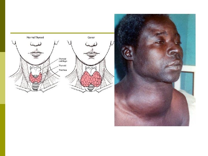 p A deficiency of iodine in the diet can result in goiter, an enlargement of the thyroid gland. Without sufficient iodine, the thyroid gland cannot synthesize adequate amounts of T 3 and T 4. p The resulting low blood levels of these hormones cannot exert negative feedback on the hypothalamus and anterior pituitary. p The pituitary continues to secrete TSH, elevating TSH levels and enlarging the thyroid. p