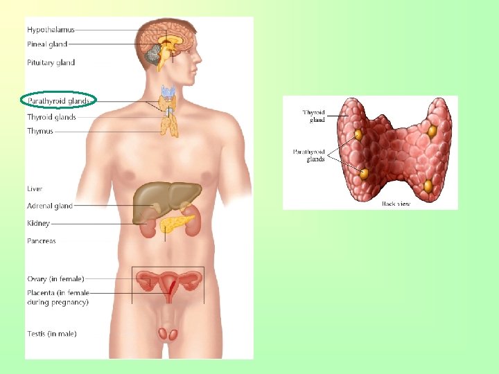 Parathyroid Gland • Four small glands behind the thyroid (size of grains of rice) • Parathormone (PTH) Regulates calcium in blood and stimulates bone cells to break down bone tissue and release calcium/phosphates into the blood • Maintains proper levels of circulating calcium