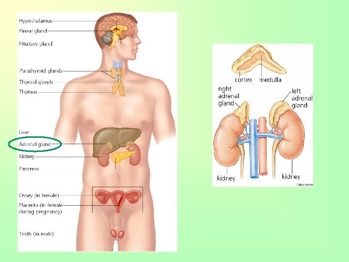 Adrenal Gland hormones Cortex • Mineralocorticoids which aid with absorption of sodium into the blood stream and the excretion of potassium from the blood stream; speeds up absorption of water in the kidneys • Glucocorticoids which aid in metabolism by increasing glucose in the blood; help body resist stress • Gonadocorticoids which reduce inflammatory responses and act as sex hormones stimulating male/female sexual Medulla • epinephrine & norepinephrine activates nervous system to act in stress & causing “flight or fight” syndrome
