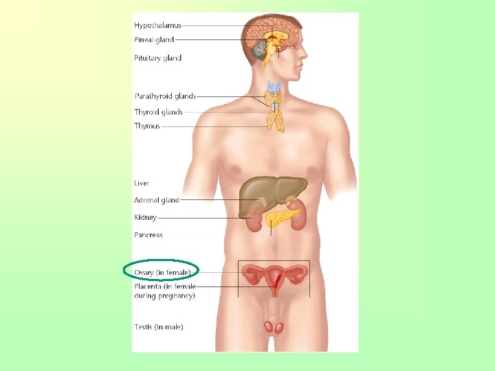 Placenta • Temporary endocrine gland produced only during childbirth • Estrogen – stimulates growth of reproductive organs • Human Chorionic gonadotropin – causes ovaries to continue secretions • Progesterone – maintains lining of uterus to provide fetal nutrition • Promotes milk production in breasts • Expelled after birth of child • “afterbirth”