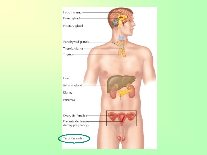 Testes • Male sex gland • Located in scrotal sac and suspended outside the body • Testosterone regulates sexual characteristics of male