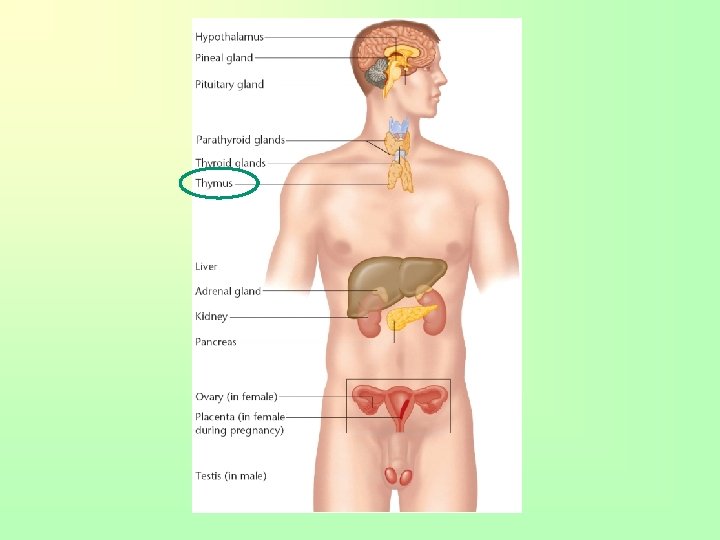 Thymus • Mass of tissue found under the sternum • “school for white blood cells” – where lymphocytes mature • Active in early life activating cells in the immune system • Atrophies during puberty • Produces only one hormone – thymosin which stimulates production of antibodies in early years