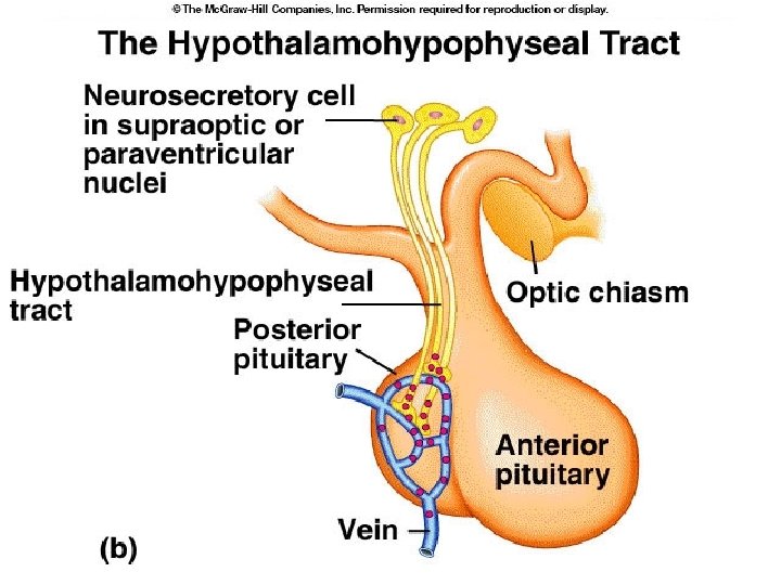 • As for the posterior pituitary, there is no connecting portal system between the hypothalamus and the posterior pituitary. • The neurosecretory cells from the hypothalamus extend to the posterior pituitary through hypothalamohypophyseal tract. • Why is this called a tract? • The secretions are called neurohormones.