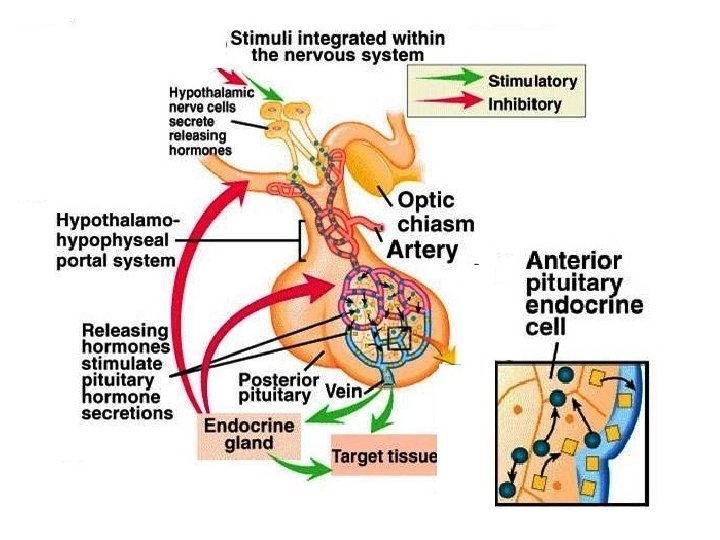 Regulation of Pituitary by Hypothalamus • In the region where the pituitary connects with the hypothalamus and the anterior pituitary, there are two capillary networks: 1) Hypothalamohypophyseal portal system as the primary capillary network. 2) Secondary capillary network in the anterior pituitary.