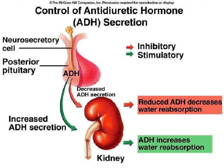 Hormones of the Pituitary Glands – Posterior pituitary hormones: • The posterior pituitary stores and releases two neurohormones formed in the hypothalamus and transmitted through hypothalamohypophyseal nerve tract. – Antidiuretic hormone (ADH): prevents production of large quantity of urine (kidneys) It is also calles vasopressin and constricts blood vessels. – Oxytocin: contracts the uterus. Important for expulsion of fetus, also ejection of milk during lactation, . – Does the posterior pituitary gland make its own hormone?
