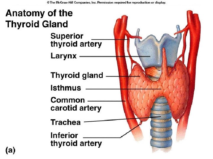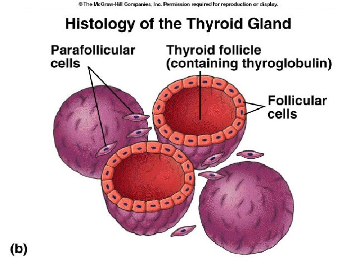 The Thyroid Gland a. Located at the upper portion of the trachea. b. Structure: – Consist of two lobes connected by a narrow band of tissue called isthmus. c. Hormones of the thyroid – The follicular cells use three or four iodine molecules to make: – triiodothyronine (T 3) makes up ~ 10% – Tetraiodothyronine (T 4) makes up ~ 90%, also known as thyroxine. – Parafollicular cells release calcitonin.