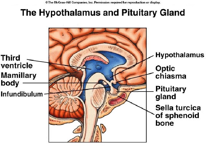 18. 2 Pituitary Gland Hypothalamus Copyright © The Mc. Graw-Hill Companies, Inc. Permission required for reproduction or display. Hypothalamus Third ventricle Mammillary body Infundibulum Optic chiasm Pituitary gland Sella turcica of sphenoid bone (a) Mammillary body Hypothalamus Optic chiasm Infundibulum Posterior pituitary (neurohypophysis) (b) Pars intermedia Anterior pituitary (adenohypophysis) • Where nervous and endocrine systems interact • Hypothalamus regulates secretions of anterior pituitary • Posterior pituitary is an extension of the hypothalamus • The pituitary produces nine major hormones that – Regulate body functions – Regulate the secretions of other endocrine glands 18 -4