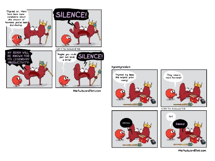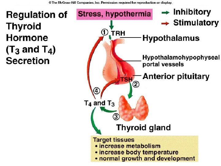 • The action of thyroid hormones • The effects of thyroid hormones are numerous Some examples are: – Hypersecretion (Hyperthyroid): increased metabolic rate, high body temperature, weight loss, increased appetite, rapid heart rate. – Hyposecretion (Hypothyroid): decreased metabolic rate, low body temperature, weight gain, loss of appetite, reduced heart rate. – Essential for the normal growth of children.