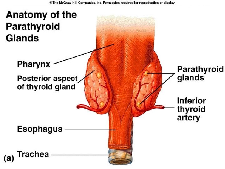 Parathyroid Glands • Location - the posterior part of each lobe of the thyroid gland. • Targets and function • The gland detects blood Ca++ levels. • PTH regulates calcium levels and targets bone, the kidneys and the intestines. • § § PTH stimulates: Osteoclast activity in bone tissue Induces Ca++ reabsorption in the kidneys. Increased Ca++ absorption by small intestines. Inactive parathyroid glands result in hypocalcaemia (low blood Ca++)