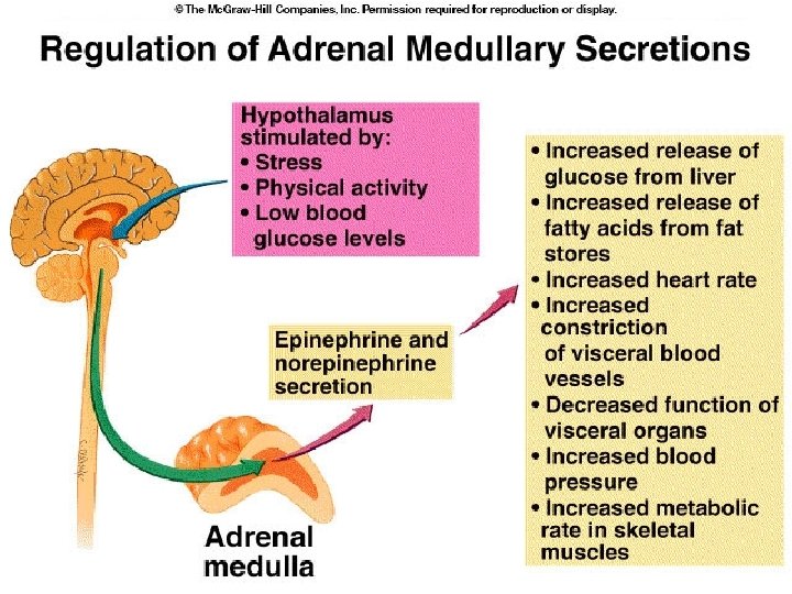 • The hypothalamus stimulated by stress, physical activities, low blood glucose levels triggers generation of action potential through the preganglionic neurons of the sympathetic division of the ANS. • These neurons stimulate the adrenal medulla to release either norepinephrine or epinephrine into the bloodstream. • The results of stimulation are: “fight or flight” – Increased release of glucose from liver – Increased released of fatty acids from fat store – Increased heart rate – Increased constriction of visceral blood vessels (increase blood pressure. )