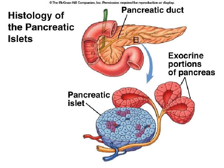 Glucagon • Secreted from alpha cells when blood glucose levels fall. • In the liver, it breaks down glycogen ( glucose stores) and releases glucose into circulation.