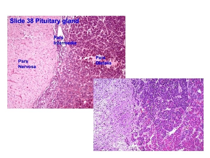 Structure of the Pituitary Gland • Posterior Pituitary (neurohypophysis) – Developmentally it is an extension of the brain. – Connected to hypothalamus by infundibulum. – Releases neurohormones • Anterior Pituitary (adenohypophysis) – Developmentally traces back to the oral cavity. – Releases regular hormones