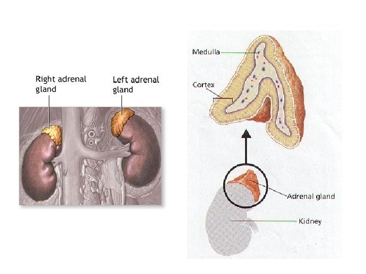 Adrenal Glands Cortex a. Cortisol (Stress released to increase blood glucose) b. Aldosterone (Controls salt & water balance) c. Androgens (small amounts of estrogen and testosterone)