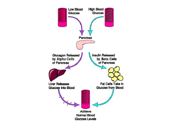 Pancreas • Insulin (Allows glucose to enter cells; LOWERS blood glucose) • Glucagon (Stimulates liver to make glucose; RAISES blood glucose)
