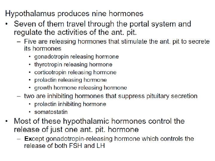 Hypothalamic releasing hormones Hypothalamic releasing hormone Effect on pituitary Corticotropin releasing hormone (CRH) Thyrotropin releasing hormone (TRH) Growth hormone releasing hormone (GHRH) Somatostatin Stimulates ACTH secretion Gonadotropin releasing hormone (Gn. RH) a. k. a LHRH Prolactin releasing hormone (PRH) Prolactin inhibiting hormone (dopamine) Stimulates TSH and Prolactin secretion Stimulates GH secretion Inhibits GH (and other hormone) secretion Stimulates LH and FSH secretion Stimulates PRL secretion Inhibits PRL secretion