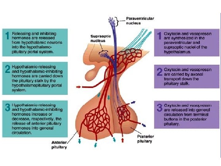Location of the pituitary gland - Just below the hypothalmus - Provide direct delivery of releasing and inhibiting hormones from the hypothalmus to the anterior lobe - direct entry of secretory neurons from the hypothalmus to posterior lobe - Hypophyseal portal circulation The venous blood drained from the hypothalmus is redistributed by another capillary system within the anterior lobe. Shortages of hormones in arterial blood are directed by specific cells within the hypothalmus, which are stimulated to secrete releasing hormones. The hormones produced are distributed by the second capillary bed to their appropriate cells in the anterior lobe.