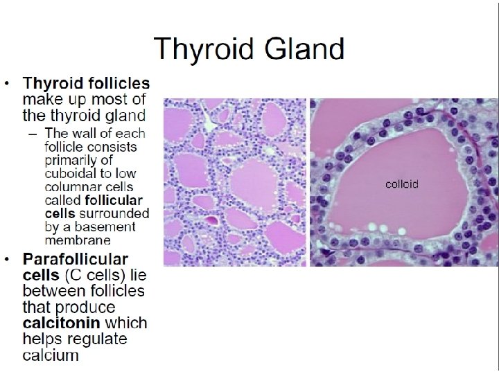 Thyroid glands Located - on the trachea just caudal to the larynx 2 laterally placed, flattened lobes joined by isthmus No isthmus in dog and cat pig has a large medial lobe instead of isthmus Thyroid gland - composed of numerous follicles lined by simple cuboidal epithelial cells filled with fluids (colloids) Colloids - gel-like substances - consists of a protein–iodine complex, thyroglobulins - hormones T 3 and T 4 are stored in the colloids