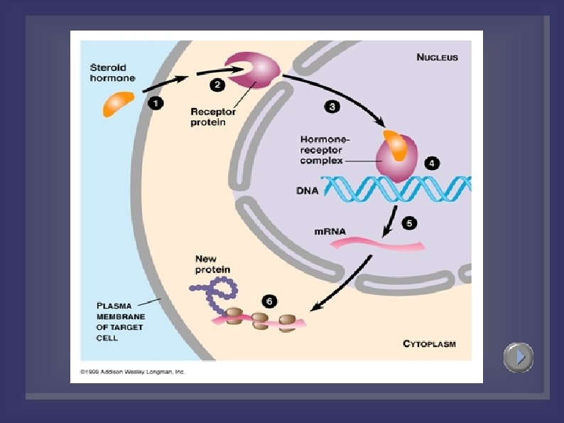 Mechanism of Action Steroid Hormones: hormones diffuse out of blood stream and into the target cells combine with receptor molecules in cytoplasm hormone-receptor complex diffuses into nucleus attaches to chromosomes and activates a gene, initiating transcription and protein synthesis.