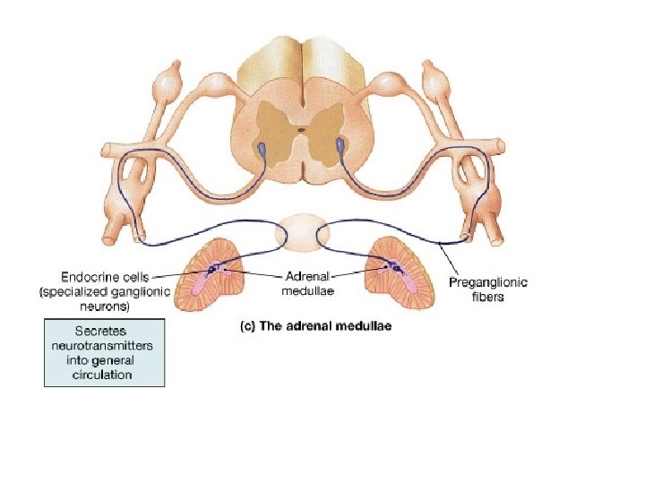 MIDOLLARE SURRENALE La parte midollare ha una diversa origine embrionale ed è innervata da fibre simpatiche pregangliari (nervi splancnici). Le sue cellule specifiche, chiamate cromaffini, liberano una miscela di catecolamine, con prevalenza di adrenalina. Gli effetti delle catecolamine circolanti si aggiungono a quelli delle stesse sostanze liberate dalle terminazioni postgangliari del simpatico, ma la maggiore concentrazione di adrenalina rende più importanti gli effetti metabolici. Esiste un tipo di tumore, generalmente benigno, chiamato feocromocitoma, che produce gravi episodi ipertensivi. Al contrario, vi può essere un’assenza ereditaria delle midollari, con sindrome ipotensiva conclamata. Tutte le condizioni che comportano un aumento del tono del simpatico fanno anche aumentare la secrezione della midollare.