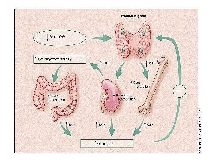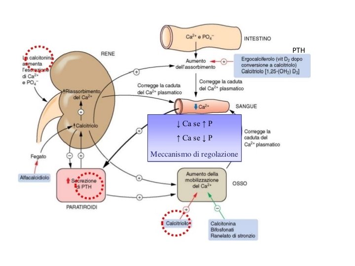 Il PTH aumenta la calciemia (concentrazione ematica di CA 2+ libero), il cui valore è mantenuto strettamente costante a 10 mg*dl-1. La secrezione di PTH è regolata a feedback negativo direttamente dalla calciemia. Il PTH interviene a tutti i livelli in cui il calcio è trattato nell’organismo, dall’assorbimento intestinale (in cooperazione con la vitamina D 3) al riassorbimento renale (favorisce anche l’escrezione dei fosfati) ed alle ossa (vedi figura). In carenza di calcio, dovuta anche all’insufficiente esposizione a raggi UV che favoriscono la trasformazione della vitamina D 1 in D 2, si ha la sindrome del rachitismo. L’ipercalciemia rende le ossa più dure (meno elastiche) e favorisce le fratture traumatiche, mentre l’ipocalciemia può produrre fratture spontanee. Il metabolismo del calcio è fortemente influenzato dagli estrogeni, la cui carenza è responsabile dell’osteoporosi nelle donne in menopausa.