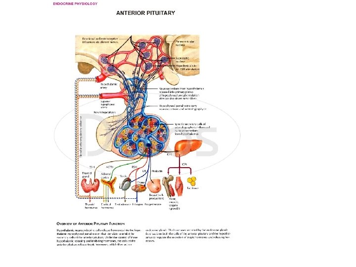 Il principale sistema endocrino è l’asse ipotalamo-ipofisi, che regola la funzione di numerose altre ghiandole endocrine e collega il sistema endocrino con quello nervoso. L’ipotalamo è collegato con l’ipofisi attraverso un peduncolo che contiene vasi e nervi: i primi formano il circolo portale ipotalamoipofisario, mentre i secondi realizzano la neurosecrezione nell’ipofisi posteriore. Tutti gli ormoni prodotti dall’ipofisi, e in parte anche i fattori rilascianti prodotti dall’ipotalamo, agiscono principalmente sulle loro cellule bersaglio, ma, essendo ormoni che entrano in circolo, hanno anche effetti diretti su altre cellule (non tutti noti). L’attività dell’asse ipotalamo-ipofisi è prevalentemente controllata a feed-back negativo dagli stessi ormoni che esso controlla