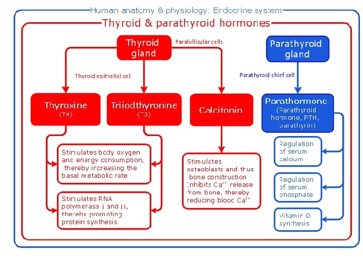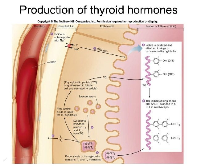 La tiroide presenta follicoli ripieni di una sostanza ialina chiamata colloide e fatta della proteina tireoglobulina: molecole molto grandi su cui sono presenti anelli di tirosina. Una speciale catena enzimatica lega uno o due ioni iodio alla tirosina, formando rispettivamente monoiodotirosina (MIT) e diiodotirosina (DIT). Una molecola di DIT lega un MIT formando triiodotirosina (T 3) oppure una altro DIT formando tetraiodotirosina (tiroxina – T 4). Le forme secrete sono T 3 e T 4 è la forma di gran lunga più abbondante, ma si trasforma in T 3 nelle cellule bersaglio. T 3 pertanto è la forma effettivamente attiva. La colloide, prodotta nel reticolo endoplasmatico e accumulata nello spazio intracellulare viene attaccata da lisosomi, che staccano gli aminoacidi iodati: T 3 e T 4 sono secreti per pinocitosi ed entrano nel torrente circolatorio, dove sono trasportati prevalentemente in legame con proteine specifiche. MIT e DIT sono deiodinati e tutti i prodotti residui sono riutilizzati per la produzione di nuova colloide, limitando il fabbisogno giornaliero di iodio. Tutte le fasi della produzione e della secrezione di ormoni tiroidei sono controllate dall’asse ipotalamo-ipofisi.