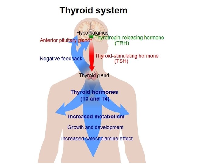 L’ipotalamo produce un fattore (TRF) che stimola la liberazione dell’ormone ipofisario TSH, che agisce direttamente sulle cellule follicolari tiroidee: aumenta la captazione dello iodio, stimola la produzione di colloide e il suo riassorbimento, regolando quindi l’immissione in circolo di T 3 e T 4. La produzione di TRF è controllata a feed-back negativo dalla concentrazione di T 3 e T 4. La carenza di iodio nella dieta, oppure il consumo prevalente di verdure che inibiscono il riassorbimento dello iodio (cavoli) (problema diffuso ad esempio in alcune vallate alpine, prima dello sviluppo delle conoscenze), provoca, oltre ad altri numerosi sintomi dell’ipotiroidismo, una caratteristica ipertrofia tiroidea che si manifesta come gozzo (ipotiroideo) perché le tirosine non iodate non possono essere secrete e si accumulano nei follicoli, continuamente stimolate dal TSH. Esistono anche varie forme di gozzo ipertiroideo, accompagnate da iperfunzione.