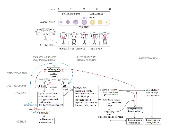 Circa a metà del ciclo, aumenta di colpo l’ormone luteinizzante e il follicolo libera un oocita e diventa corpo luteo, che produce abbondanti quantità di progesterone. Questo arresta lo sviluppo dell’endometrio, ma ne stimola la secrezione. In assenza di fecondazione, dopo circa due settimane il corpo luteo si atrofizza e ne segue lo sfaldamento dell’endometrio che dà luogo al flusso mestruale.