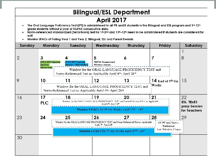 Tentative State Assessments Results Dates/ LPAC Meetings State Assessment Results: 5 th and 8 th grade Reading-------by April 18 th and May 30 th TELPAS-------------------by April 28 th 3 rd-4 th grade Reading----------by June 14 th English I-II-----------------by June 2 nd EOY OLPT Testing Window: April 3 th- April 28 th (Students without 2 consecutive years of TELPAS data) EOY Terra Nova Testing Window: April 3 rd- April 28 th (For potential 1 st, 2 nd grade and 11 th-12 th grade exits) Suggested EOY LPAC Meetings Timeframes: May 1 st – 23 rd